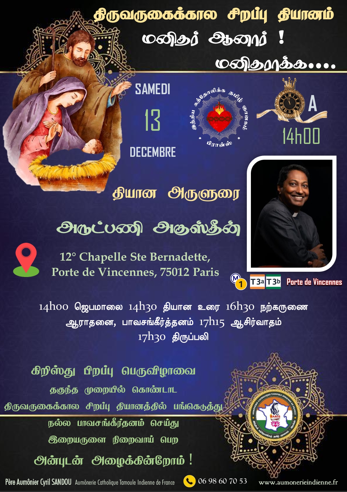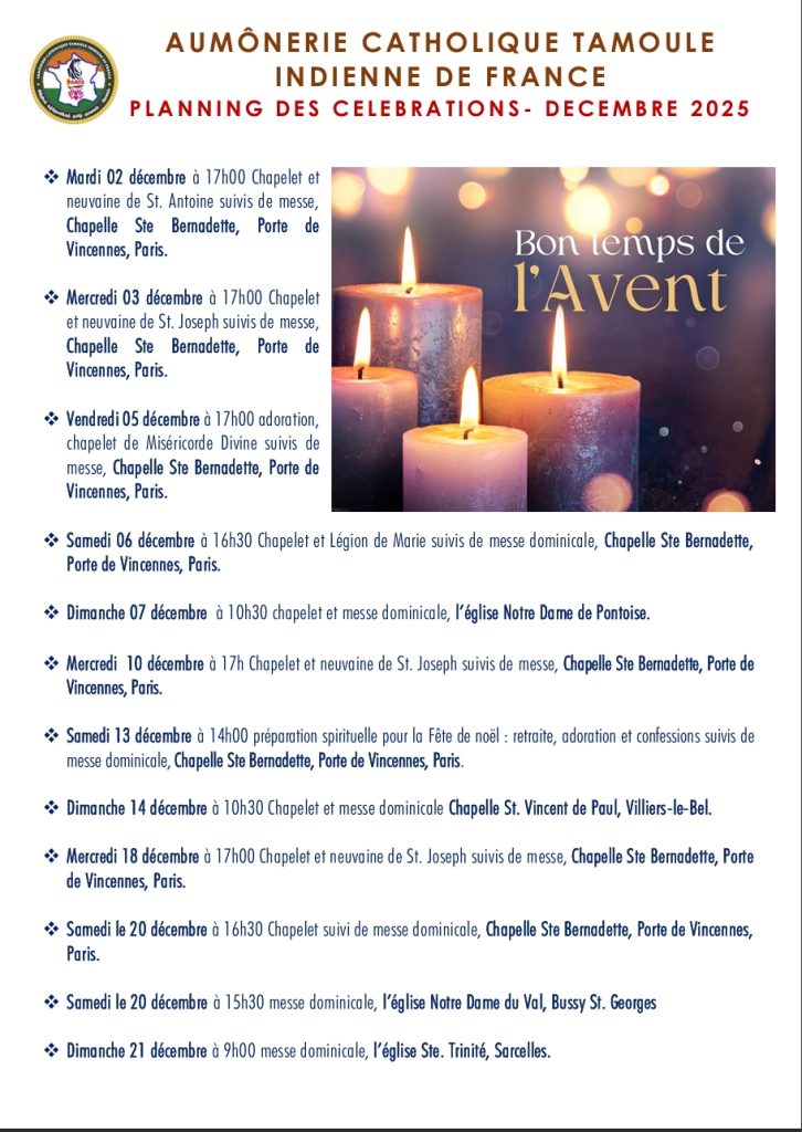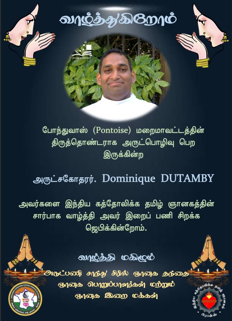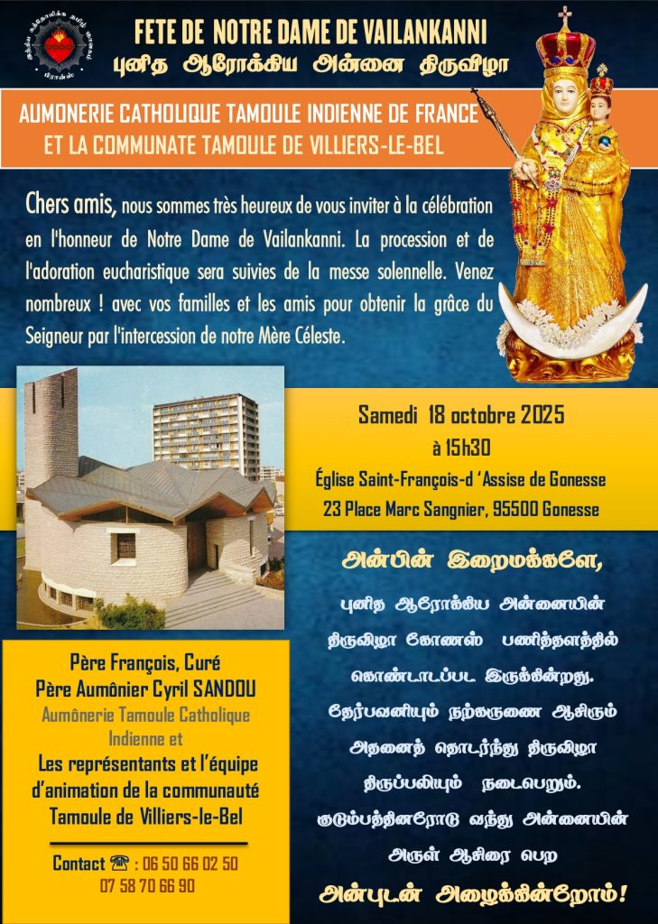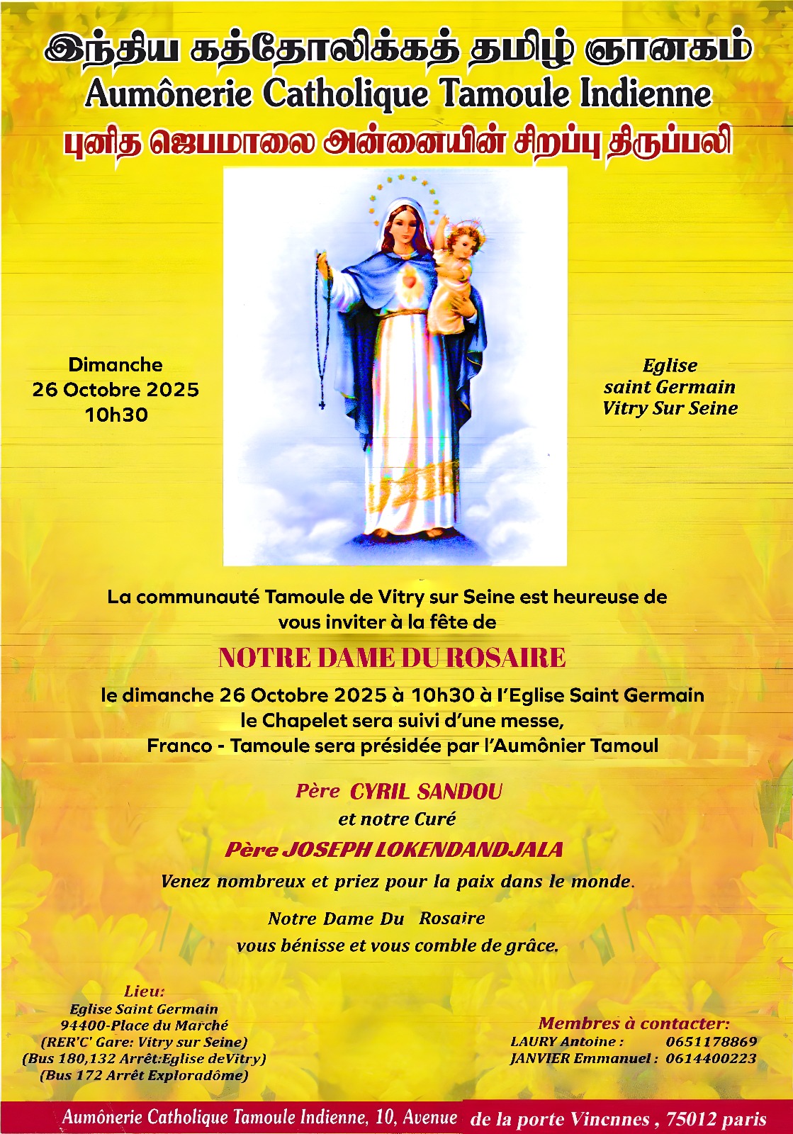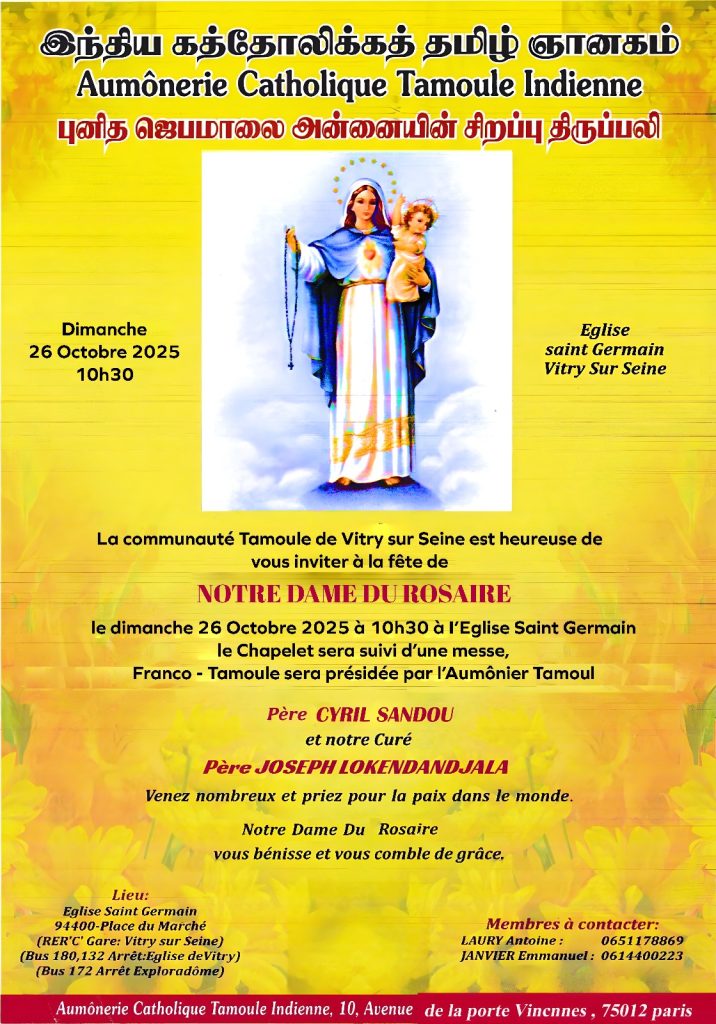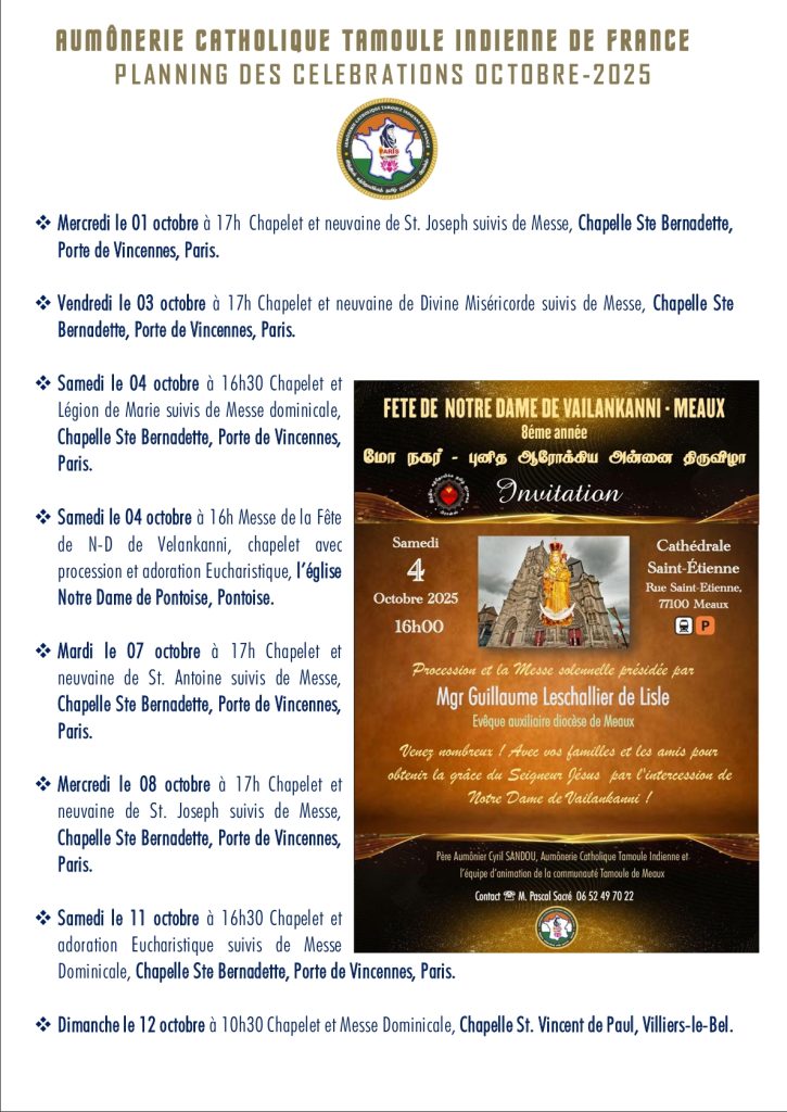 Vous êtes catholique d’origine tamoule indienne vivant en France et vous avez besoin d’une aide spirituelle, pastorale ou sacramentelle ? Vous souhaitez que votre célébration liturgique soit célébrée en tamoul, en français ou en anglais ? N’hésitez pas à nous contacter.