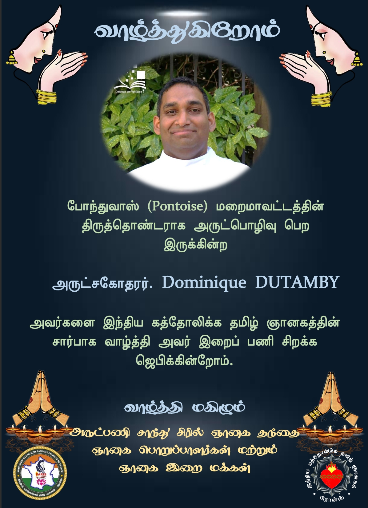 உங்கள் ஆன்மீக தேவைகள் மற்றும் திருவருட்சாதன கொண்டாட்டங்கள் எதுவாயினும் தமிழ், பிரெஞ்சு, ஆங்கில மொழிகளில் நிறைவேற்ற இந்திய கத்தோலிக்க தமிழ் ஞானகத்தை தொடர்பு கொள்ள தயங்க வேண்டாம்.